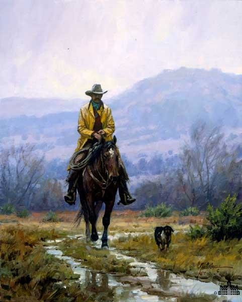 " HEADIN HOME " 95 s/n Giclee Canvas 16" x 20" Email-price Martin Grelle - Headin Home MARTIN GRELLE ( 1954– ) < BACK TO ARTISTS Martin Grelle, b. 1954, Clifton, Texas, (United States) Born & raised in Clifton, Texas, Martin Grelle and his wife, Joyce, still live on a small ranch a few miles from town. His studio sits in the picturesque Meridian Creek Valley, surrounded by the oak & cedar-covered hills of Bosque County, just a short distance from his home, but also within a few miles of the family & friends who are so important in his life. He has two sons, Josh & Jordan, who have left home to pursue their own dreams, but who stay in touch frequently. Grelle’s parents, Ervin & Ella, have both passed from this life, but he still has his brothers, Carl & Marvin, living nearby, as well as his sister, Mary, who lives in Ft. Worth. Joyce’s 3 sons, Zach, Emitt & Carl, and their families are also close, and visit the ranch often. Grelle began drawing & painting when he was very young, and was fortunate to have James Boren & Melvin Warren, two professional artists and members of the prestigious Cowboy Artists of America, move to the area when he was still in high school, and it has had a lasting impact on his direction & career. Mentored by Boren, he had his first one-man show at a local gallery within a year of graduating from high school in 1973. In the 44 years since that time, he has produced some 30 one-man exhibitions, including annual shows at Overland Gallery in Scottsdale, Arizona from 1989 through 2014, and has won awards of both regional & national importance at shows around the country. Grelle was invited into membership with the Cowboy Artists of America in 1995, fulfilling a dream that began in the early 70’s when he first met Boren & Warren. That same year he was invited to participate in the first Prix de West Invitational at the National Cowboy & Western Heritage Museum in Oklahoma City. Since that time he has won the Prix de West Purchase Award, twice (one of only seven artists to do so), the Nona Jean Hulsey Rumsey Buyers’ Choice Award, twice, the CA People’s Choice Award in 2002, the CA Ray Swanson Award in 2008, the CA Buyers’ Choice Award in 2011, 2012, and 2014, and the Silver Award for Water Solubles in 2012 and 2014. He was awarded the Legacy Award by The Briscoe Museum in 2012, for his impact on western art, and was presented the Spirit of the West Award by the San Dimas Festival of Arts in April of 2016. Other major invitational exhibitions & sales Martin has participated in include The Masters at the Autry Museum in Los Angeles, and the Quest for the West at the Eiteljorg Museum in Indianapolis, the Coeur d’Alene Auction, and the Jackson Hole Art Auction. Grelle has also been featured in a number of publications throughout his career, including multiple appearances in ART OF THE WEST and WESTERN ART COLLECTOR magazines, SOUTHWEST ART, WESTERN ART & ARCHITECTURE, PERSIMMON HILL, AMERICAN COWBOY, WESTERN HORSEMAN, INFORMART, WILD WEST, & was listed in TRUE WEST magazine’s 2011 Best of the West Source Book. He was honored with a retrospective showing of his work, along with fellow CA artist, Herb Mignery, for the Gilcrease Museum’s Rendezvous Show 2013. Martin Grelle has a real sense of responsibility to his collectors, which fills his heart every morning when he walks into the studio, believing that what he does is a gift entrusted to him from God, and must not be left unused or taken for granted, but developed and improved upon. His parents, and Jim & Mary Ellen Boren, all set that example for him – an example of not only striving to be the best artist he can be, but the best man he can be as well. Beyond his studio, Grelle strives to pass on what others have passed to him. He has given multiple demonstrations around the country, teaches an annual weekend workshop along with his good friend, and fellow CA, Bruce Greene – which they have done for 24 years straight - and mentors other aspiring artists by critiquing their work. He has donated work to a large number of organizations to aid in their progress, including The Bosque Arts Center in Clifton, Texas. Grelle has twice served on the board of directors for the CA organization, serving as President for 2014, and as Chairman of CAA 50th Anniversary Events during 2015. He is also involved with The Joe Beeler Foundation, founded by the Cowboy Artists of America to coincide with their mentoring program, which provides scholarship opportunities for artists seeking to improve their skills, and has served on the Board of Directors for the past several years, and as President during 2014-2015. Education • Self-taught; mentored by James Boren • Cowboy Artists of America Museum, Kerrville, TX, Workshop, Harvey Johnson/Melvin Warren, 1983 • Bosque Conservatory, Clifton, TX, Workshop, Bettina Steinke Selected Collections • National Cowboy & Western Heritage Museum, Oklahoma City, OK • Booth Western Art Museum, Cartersville, Georgia • Erivan & Helga Haub Family Awards • San Dimas Festival of Arts, San Dimas, California, Spirit of the West Award, 2016 • National Cowboy & Western Heritage Museum, Cowboy Artists of America Exhibition, Silver Award, Water Solubles, Oklahoma City, OK, 2014 • National Cowboy & Western Heritage Museum, Cowboy Artists of America Exhibition, People’s Choice, Oklahoma City, OK, 2014 • Gilcrease Museum - Rendezvous Retrospective, 2013 • National Cowboy & Western Heritage Museum, Cowboy Artists of America Exhibition, Silver Award, Water Solubles, Oklahoma City, OK, 2012 • Briscoe Western Art Museum, Legacy Award, San Antonio, TX, 2012 • National Cowboy & Western Heritage Museum, Cowboy Artists of America Exhibition, Buyers Choice, Oklahoma City, OK, 2012 • National Cowboy & Western Heritage Museum, Cowboy Artists of America Exhibition, Buyers Choice, Oklahoma City, OK, 2011 • Phoenix Art Museum, Cowboy Artists of America Exhibition & Sale, Ray Swanson Me