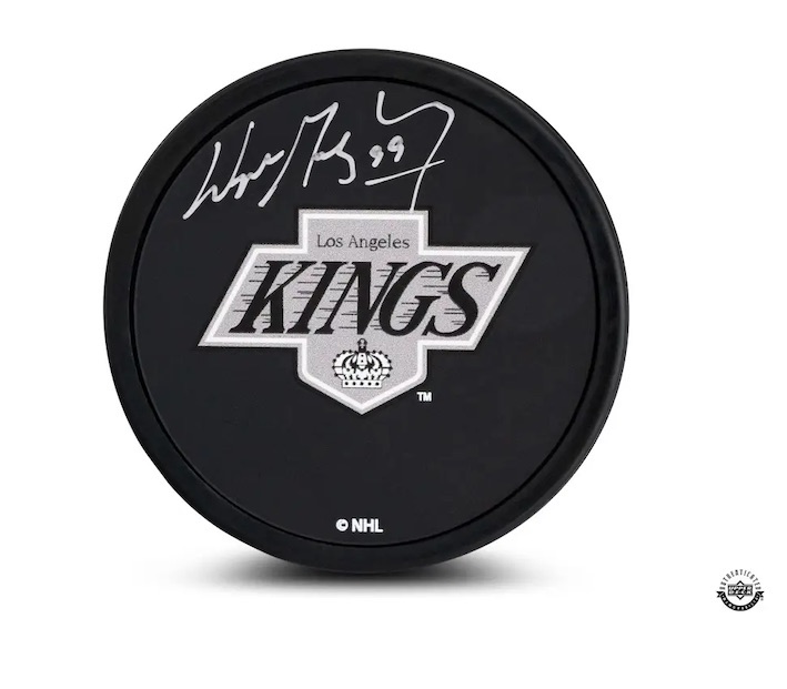 AUTOGRAPHED Autographed Hockey Puck After being traded from the Oilers to the Kings in the summer of 1988 Wayne Gretzky would make an immediate impact with his new team. Gretzky was named alternate captain upon arriving to the Kings and would score on his very first shot on goal. Gretzky would win the Hart Trophy for MVP in his first season with the Kings and lead them to a playoff upset of his former team the Edmonton Oilers. While Gretzky’s time with the Kings included numerous personal accomplishments he also helped to inspire fan interest in hockey in Southern California as the Kings immediately saw an increase in attendance and enjoyed sellouts regularly during Gretzky’s tenure with the Kings. To commemorate his time in LA, the Kings unveiled a statue of Gretzky waving to the fans outside of Crypto.com Arena. This LA Kings logo hockey puck is autographed by Wayne Gretzky. Gretzky’s signature was witnessed by an Upper Deck representative as part of UDA’s 5-step authentication process. |