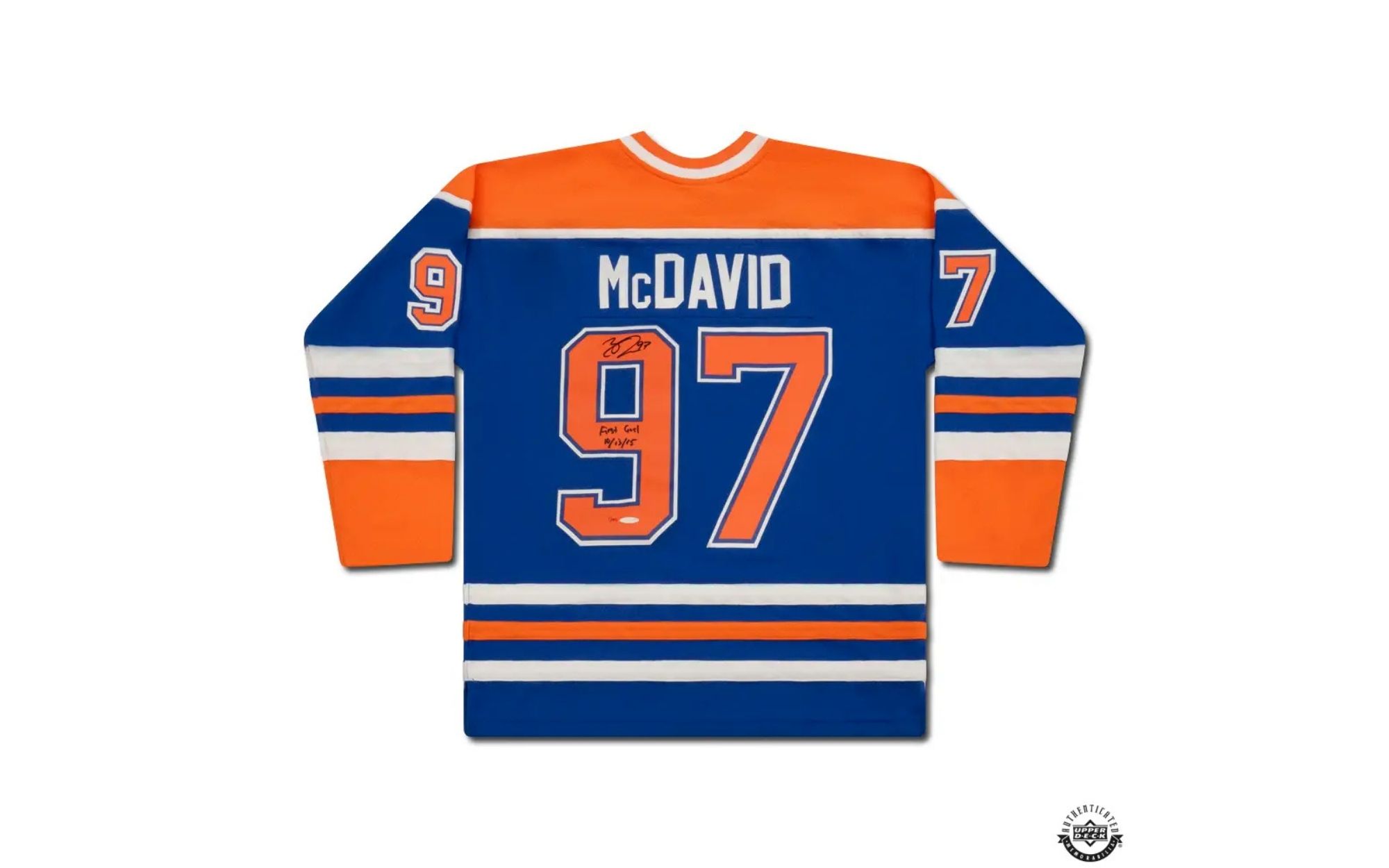 Drafted first overall by the Edmonton Oilers in the 2015 NHL Entry Draft Connor McDavid made his debut with the Oilers on October 8th, 2015 in a 3 -1 loss to the St. Louis Blues. 5 days later, on October 13th, McDavid scored his first NHL Goal in the second period to tie the game against the Dallas Stars. With the goal McDavid joined some prestigious company joining Sidney Crosby and Wayne Gretzky as players to score their first NHL goal in their third career game. The following season, the Oilers named McDavid the captain of the team; at 19 years and 266 days old McDavid became the youngest captain in NHL history. On October 11, 2023, the Oilers opened the 2023-24 season with McDavid as their captain for his 8th consecutive season, a franchise record as no Oilers player has ever served longer than 5. This authentic Edmonton Oilers blue Mitchell & Ness 2015 alternate jersey is autographed & inscribed “1st Goal 10/13/15” by Connor McDavid. McDavid’s signature and inscription were witnessed by an Upper Deck representative as part of UDA’s 5-step authentication process. This item is limited to 97.