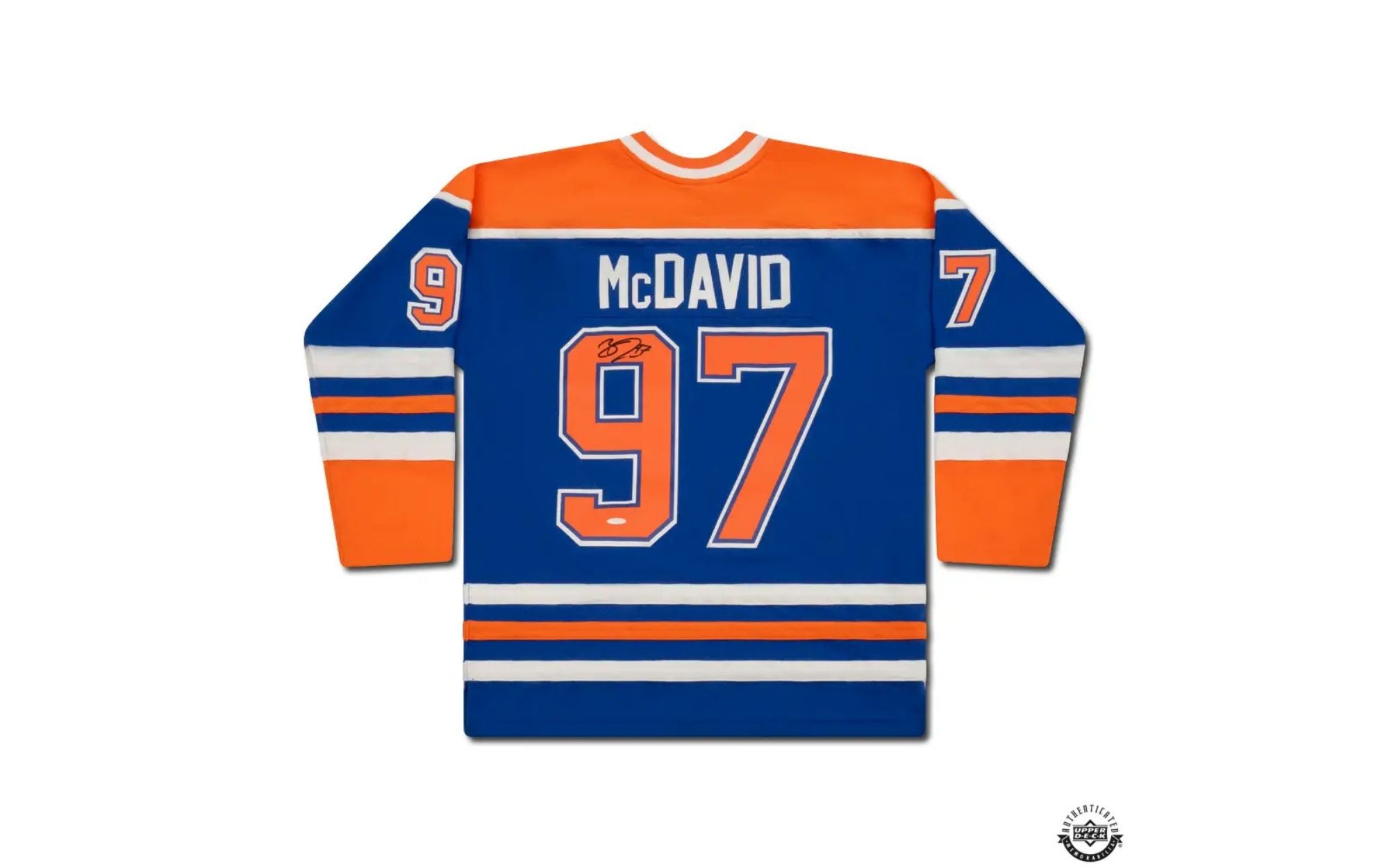 " 2015 MITCHELL & NESS Signed In BLACK Pen Drafted first overall by the Edmonton Oilers in the 2015 NHL Entry Draft Connor McDavid made his debut with the Oilers on October 8th, 2015 in a 3 -1 loss to the St. Louis Blues. 5 days later, on October 13th, McDavid scored his first NHL Goal in the second period to tie the game against the Dallas Stars. With the goal McDavid joined some prestigious company joining Sidney Crosby and Wayne Gretzky as players to score their first NHL goal in their third career game. McDavid would miss 45 games of his rookie season due to injury but still finished with 16 goals and 32 assists, fourth in rookie scoring and third in Calder Memorial Trophy voting, a remarkable feat considering he missed more than half the season. This authentic Edmonton Oilers blue Mitchell & Ness 2015 alternate jersey is autographed by Connor McDavid. McDavid’s signature was witnessed by an Upper Deck representative as part of UDA’s 5-step authentication process.