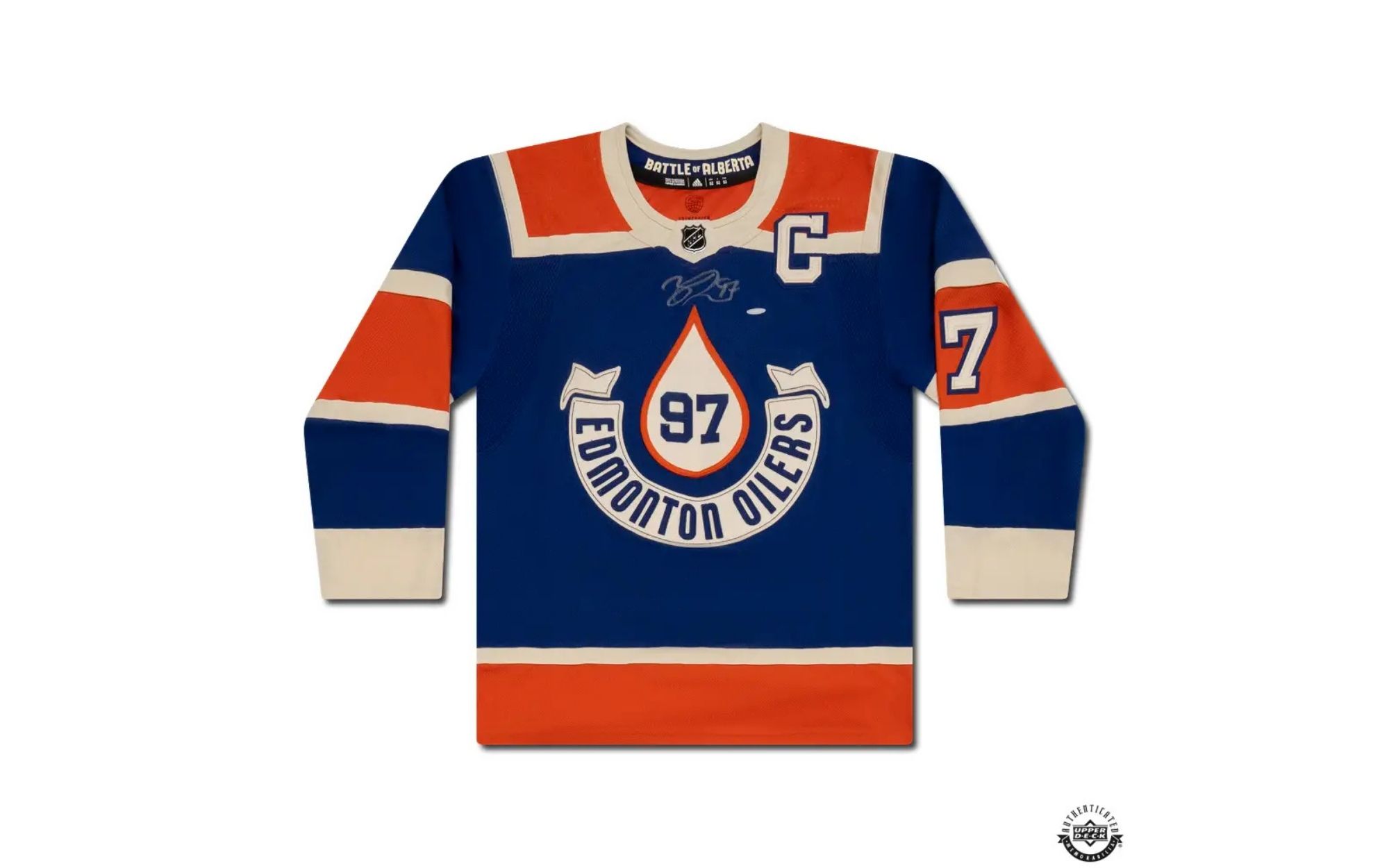 " 2023 HERITAGE CLASSIC Signed In SILVER Pen The very first NHL Heritage Classic was held on November 22, 2003, at Commonwealth Stadium in Edmonton, Alberta between the Montreal Canadiens and the Edmonton Oilers. It was the first NHL regular season game to be played outdoors and was a hit, drawing a crowd of 57,167 despite temperatures of close to -22 degrees Fahrenheit. 20 years later the Oilers again hosted the Heritage Classic, the 7th ever Heritage Classic was to feature the first ever outdoor version of “The Battle of Alberta”, the Oilers vs the Flames. With both teams featuring custom jerseys specifically designed for the Classic and the Oilers featuring the NHL’s best in Connor McDavid, the hype was again at a fever pitch. Before a sellout crowd of more than 55,000, the Oilers would beat the Flames 5-2 and with the help of McDavid (1 assist) would win the first ever outdoor version of the Battle of Alberta. This authentic Edmonton Oilers royal blue Adidas 2023 Heritage Classic authentic jersey is autographed by Connor McDavid. McDavid’s signature was witnessed by an Upper Deck representative as part of UDA’s 5-step authentication process