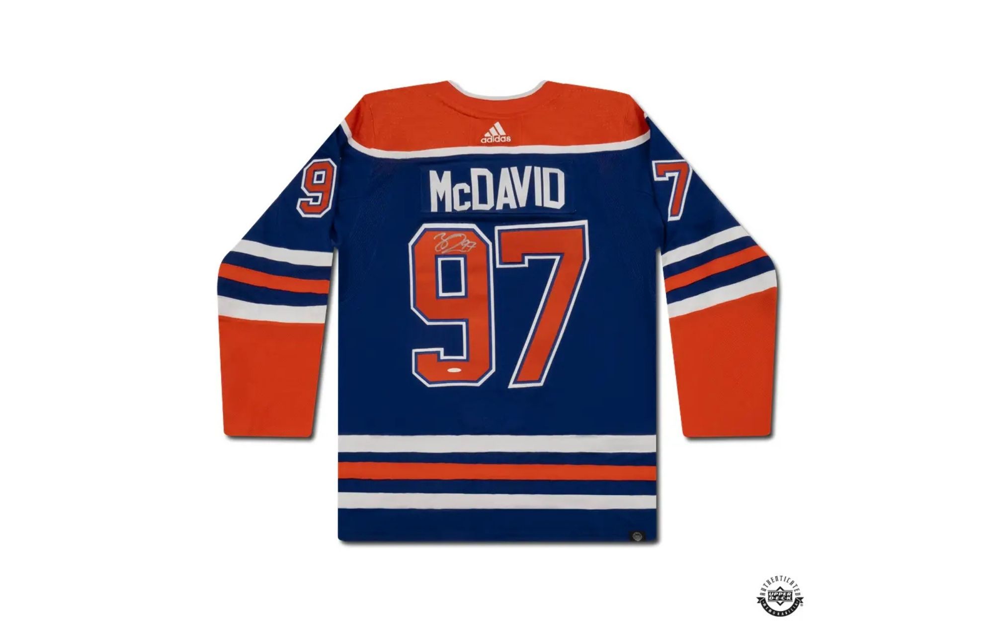 " CONNOR MCDAVID Signed In SILVER Pen One of the most iconic jerseys in NHL history, the vintage blue Oilers jerseys takes Oilers fans back to the championship days of Wayne Gretzky. They are, have been, and probably always will be the best-selling style Oilers jersey. From 2017-2021 the Oilers had switched jersey styles using a primary jersey comprising of mostly orange with a splash of dark blue and white trim. To begin the 2022 season the Oilers switched their primary home jerseys back to the classic blue and orange and it was met with an almost universally positive response from fans. As the Oilers look to reclaim their first Stanley Cup title since 1990 fans now get to watch them play in the same jerseys they watched in the dynasty years of Gretzky. This authentic Edmonton Oilers royal blue Adidas jersey is autographed by Connor McDavid. McDavid’s signature was witnessed by an Upper Deck representative as part of UDA’s 5-step authentication process.