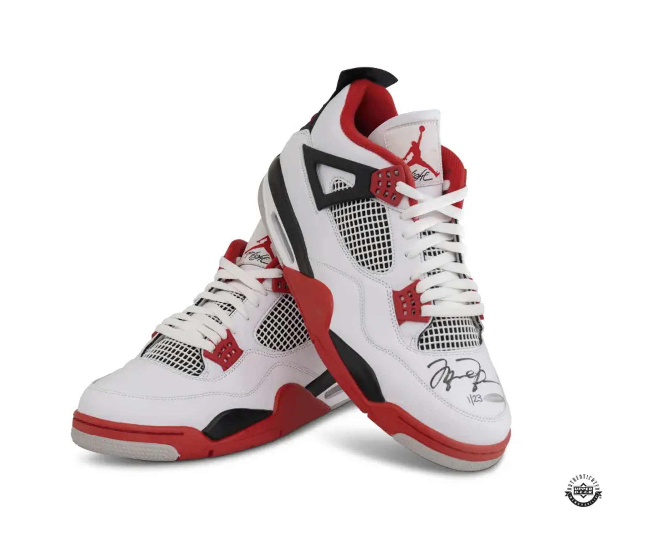 Nike Air Jordan 4 Fire Red Retro shoes in black paint pen. His signature is deemed authentic by