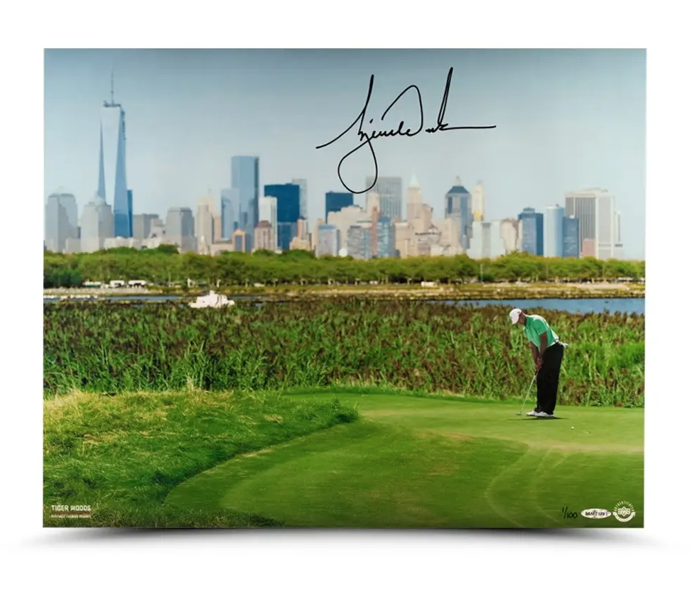 has had the opportunity to play the best golf courses in the world. While certain golf courses are known for a particular hole or bunker, others are remembered for their scenic views and picturesque landscaping. 'NYC' is a signed print of Tiger Woods punting on the 14th green during The Barclays PGA golf tournament in Paramus, New Jersey. The New York City skyline is the scenic backdrop for this limited edition (100) print. Woods' black signature has been authenticated by virtue of Upper Deck Authenticated's Five-Step Authentication Process.