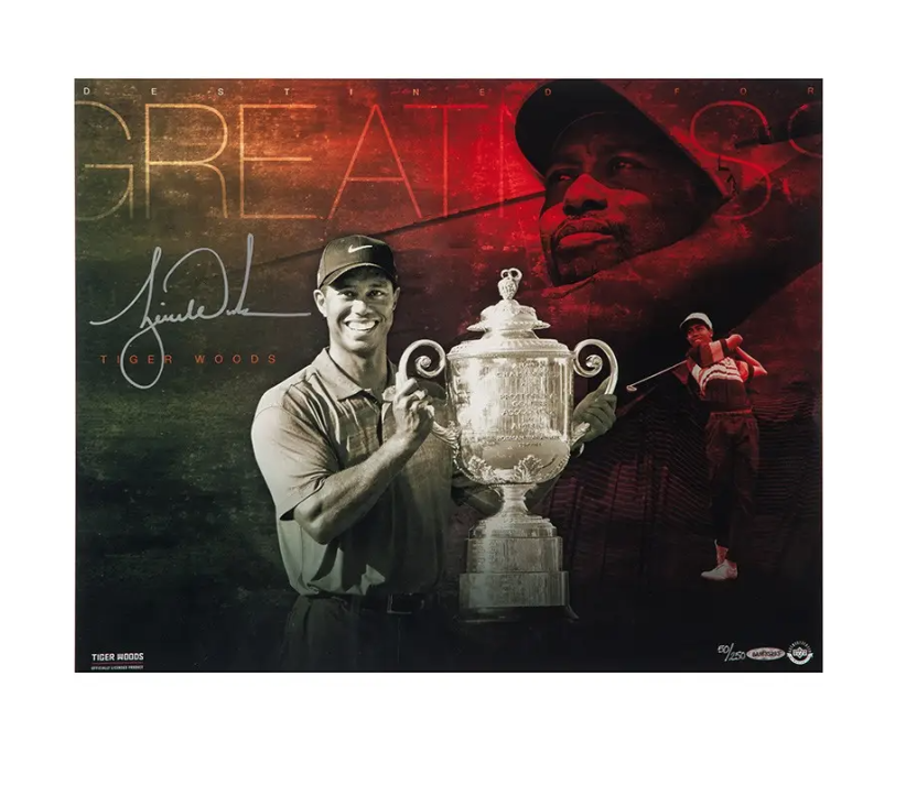 Tiger Woods has been destined for something special. It didn't come without hard work though. He practiced and studied the game to the point where he entered the PGA Tour as one of the most qualified and skilled golfers in history. Woods won the Junior World Championships six times and was the youngest U.S. Junior Amateur champion in history at the age of 15. He participated in his first PGA major at the age of 19 in the 1995 Masters. He turned pro the next year and has since captured 14 career major titles and 79 PGA Tour tournaments overall. This designed piece features three images of Woods at different stages of his career, from beginner to champion. Woods has autographed this limited edition (250) 'Destined For Greatness' 20" x 16" designed image in silver paint pen. His signature is deemed authentic by virtue of Upper Deck Authenticated's Five-Step Process.