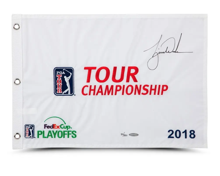winning on the PGA Tour after teeing off in one event in 2016 and '17 combined, anyone who knows Woods was confident he would emerge a champion again. The stage was set for yet another dramatic performance for one of the greatest athletes of all time when he teed off at the 2018 Tour Championship at East Lake Golf Club in Atlanta. He opened the tournament with a 65 and a tie for first place with Rickie Fowler in the 30-player field. It wasn't a fluke as he went on to drive accurately, approach smartly and putt brilliantly as he won in dramatic fashion Sunday with a two-stroke win over Billy Horschel. It was an amazing way to win as this event was widely considered the final event of the 2018 PGA Tour season. The tournament was also the final event of the FedEx Cup Playoff as the pin flag calls that out with a special embroidery. Woods has autographed this limited edition (500) 2018 Tour Championship pin flag in black paint pen. His signature is deemed authentic by virtue of Upper Deck Authenticated's Five-Step Process.