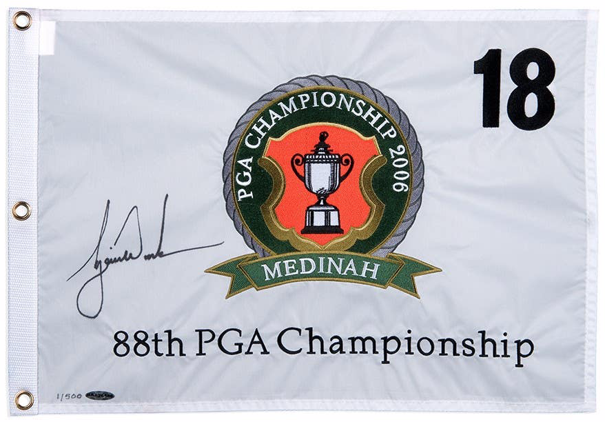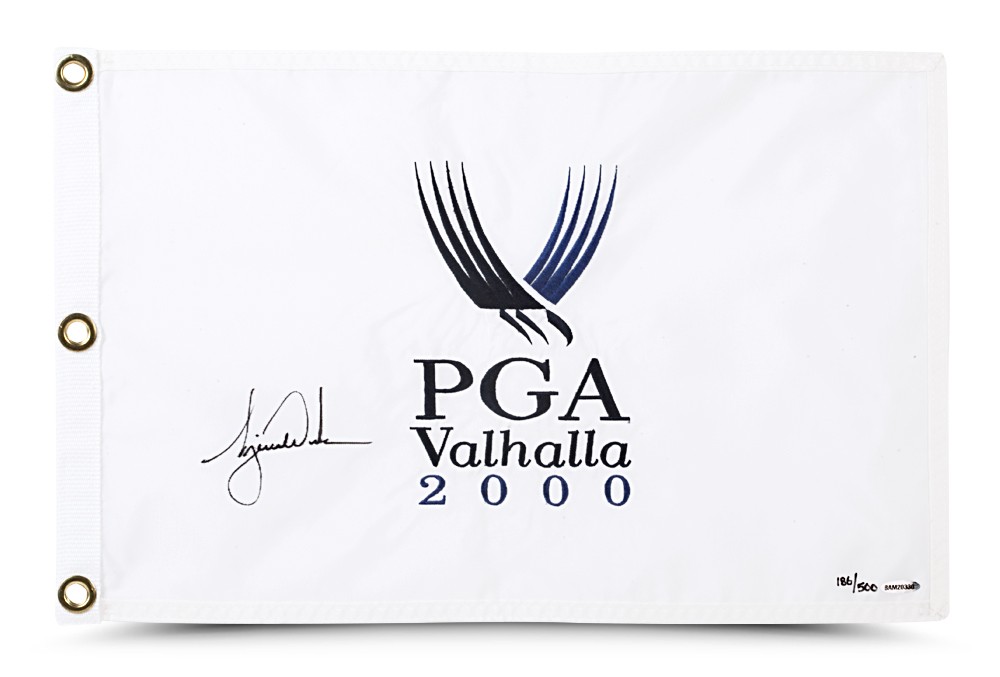 AUTOGRAPHED 2000 PGA CHAMPIONSHIP PIN FLAG 500 s/n Limited Edition Pin Flag Tiger Woods won the 2000 PGA Championship at the Valhalla Golf Club in Louisville (KY) by out-dueling Bob May. Both had finished a remarkable final round at 18-under-par 270 (a new scoring record), but it was Woods who prevailed by one stroke following an exciting three-hole playoff. Now collectors can better appreciate Tigers perseverance via this limited edition (500) hand signed pin flag from the 2000 PGA Championship. Woods’ has inked his signature in black paint pen. This pin flag is authenticated by UDAs Five-Step Process.