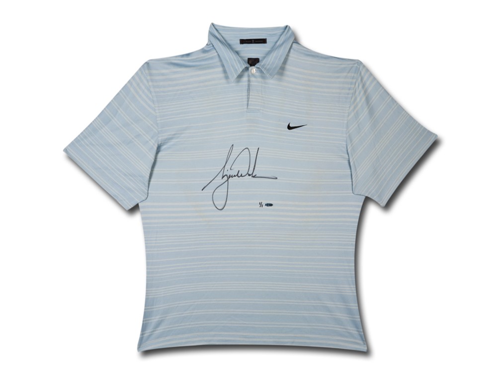 AUTOGRAPHED 1 s/n Limited Edition Shirt Tiger Woods is the all time leader in PGA tournament wins and second in major wins with (14). Woods usually draws the largest gallery of spectators when playing in a tournament. Spectators have become custom to seeing him wearing red on Sunday’s, and any other color under the rainbow between Thursday and Saturday. Tiger wore this light blue polo during a PGA TOUR, USGA and/or WGC tournament event. This Nike polo is genuine and authentic as being tournament-worn by Tiger Woods and was legally procured directly from Tiger Woods. Tiger's exclusive partner for autographed memorabilia, Upper Deck Authenticated guarantees the authenticity of Tiger's signature on this polo through its Five-Step Authentication Process.