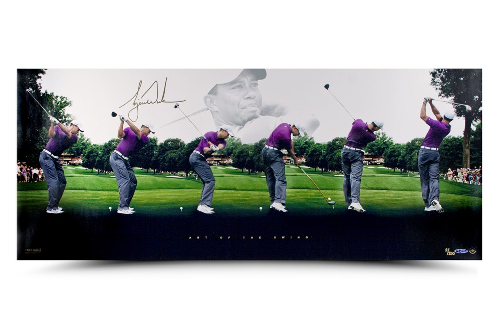 TIGER WOODS 250 s/n Limited Edition Panoramic Picture Since joining the PGA Tour in 1996, Tiger Woods has won 75 PGA tour events (second all time) and 14 Major Championships (second all time). How has Woods been able to win so many golf tournaments in his 16-year career? Tiger has mastered the “Art of the Swing.” Woods has been practicing his swing since he began playing the sport at the age of two. While there have been minor changes in his swing over the years, his unique stroke invoking both power and grace has stayed true to form. This specially designed Upper Deck Authenticated 36x15 panoramic image showcases six images of Tiger’s swing from the beginning of his backstroke all the way past his follow through. This limited edition (250) panoramic picture also features a facial image of Woods. Tiger has inked his impressive autograph in gold paint pen. Wood's autograph has been authenticated by virtue of Upper Deck Authenticated's Five-Step Process.