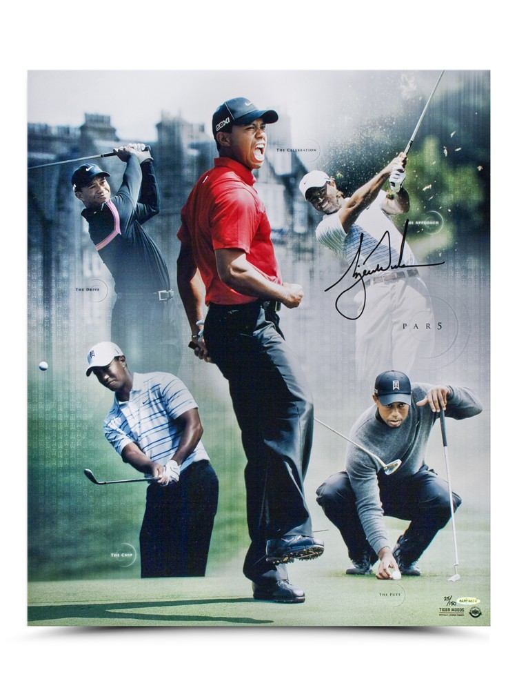 TIGER WOODS AUTOGRAPHED 150 s/n Limited Edition Print The game of golf is universally comprised of four types of shots: the drive, the approach, the chip, and the putt. This limited edition (150) UDA-designed collage pays homage to Tiger Woods and the game of golf and measures 20" x 24".