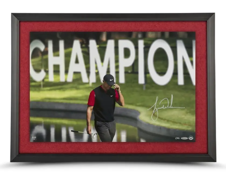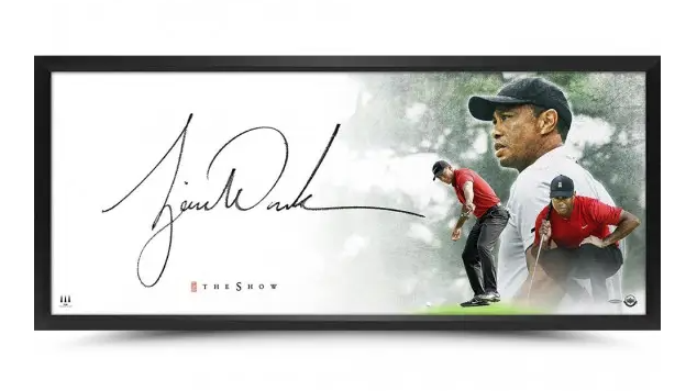 “The Show” features a custom acetate overlay of Tiger Woods with his oversized autograph that takes up approximately three squared feet of the image. It is by far the largest signature of Tiger Woods that Upper Deck has ever produced. This breathtaking 46”x20” framed display shows Tiger in his Sunday red polo following through his tee shot with a grayscale tree-lined golf course in the background. Tiger has inked his massive signature in black. The golf greats’ three-foot signature was witnessed under UDA’s Five-Step Authentication Process.