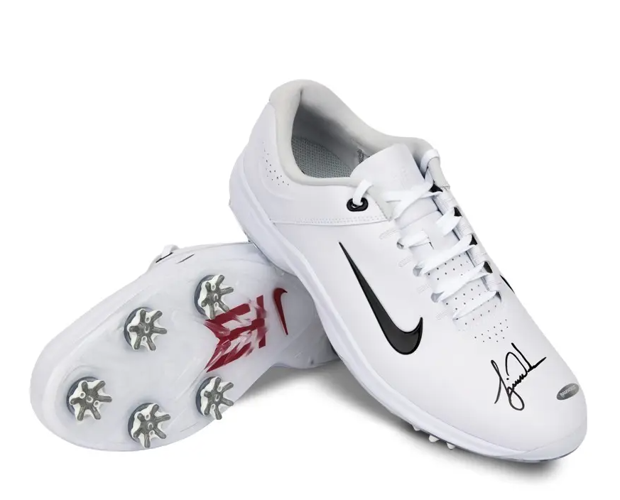 TIGER WOODS Signed Golf Shoes The Nike brand has released some of the most innovative, influential, and unique shoes that the industry has ever seen. Tiger Woods has been part of the Nike family since 1996 when he turned pro. Nike had been in the golf business since 1984, but it was the signing of Woods that elevated the Nike Golf brand. Woods has had his own signature line since day one, when they released his Air Zoom TW and Air Zoom Sport TW shoes. This past June Nike released the TW 13’s, their newest and most innovative Tiger Woods golf shoes yet. The TW 13’s are designed using the Nike ‘Free’ shoe platform technology, and then customized for Tiger Woods. These white retail TW 13’s have been signed by Woods in black paint pen. His autograph has been authenticated by virtue of UDA's Five-Step Authentication Process.