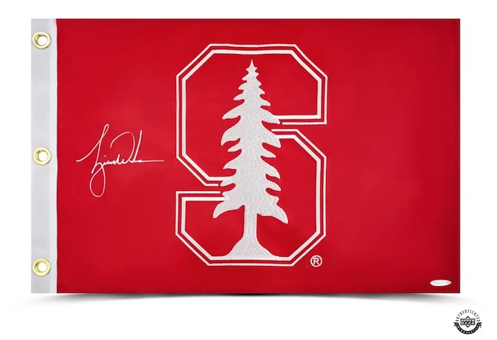 TIGER WOODS AUTOGRAPHED Signed in Silver Ink Tiger Woods began his college career at Stanford in the fall of 1994. Woods was named Pac-10 Player of the Year, NCAA First Team All-American, and Stanford Male Freshman of the Year during his tenure at Stanford. In 1996, Woods won the NCAA individual title and was awarded Jack Nicklaus National Player of the Year. With 11 tournaments, Woods tied Stanford's record, including an incredible 8 wins in 13 starts in 1996. In 2009 Stanford inducted the golf legend into the Stanford Athletics Hall of Fame. Despite his early departure, he continues to support the Stanford Cardinals by attending football games and contributing a portion of his tournament proceeds to Stanford University. Upper Deck Authenticated has had Tiger Woods sign this Stanford pin flag in silver paint pen. Woods' signature has been authenticated by virtue of Upper Deck Authenticated's Five-Step Authentication Process.