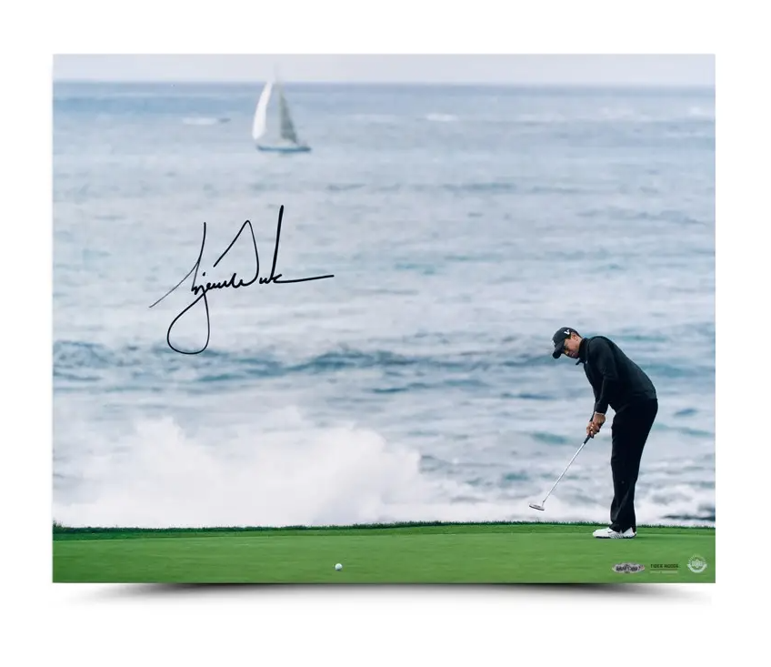 AUTOGRAPHED Signed Print The 2000 PGA Championship was one for the ages for many reasons. It was the final PGA for Jack Nicklaus, who was paired with Tiger Woods at the age of 60. Woods and Bob May set the PGA Championship record by each finishing at 18-under par, a mark Woods would equal six years later. May fired off a 66 in each of the final three rounds to force the playoff with Woods. Tiger was his typical focused self down the stretch, however, as he won a three-hole playoff and went on to capture his second consecutive PGA Championship and his fifth major overall. In this image at Valhalla Golf Club, Woods points to the ball after sinking a putt in the playoff. Woods has signed this 2000 PGA Championship 20” x 24” image in gold paint pen. His signature is deemed authentic by virtue of Upper Deck Authenticated’s Five-Step Process.