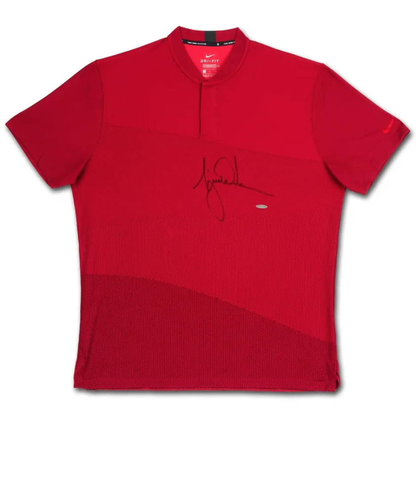 " AEROREACT BLADE POLO " 50 s/n Limited Edition Shirt If the clothes make the man, Tiger Woods has established himself as an iconic in the golf world not only because of his amazing career, but also because of his influence over golf’s fashion. His selection of Nike polos have always turned heads on the course, and his classic red polo is a staple of his collection of amazing Sunday victories. He won 14 major championships until debilitating injuries derailed his quest of overtaking Jack Nicklaus’ record of 18. He had won at least one major tournament every year between 2005 and 2008 when he captured his third career U.S. Open title. But then came a major drought of not winning a major until he broke through with an epic win in the 2019 Masters Tournament, a victory that will go down in the annals of greatest comebacks in sports history. Woods has autographed this limited edition (50) Nike red Vapor AeroReact Blade OLC polo in black paint pen. His signature is deemed authentic by virtue of Upper Deck Authenticated’s Five-Step Process.