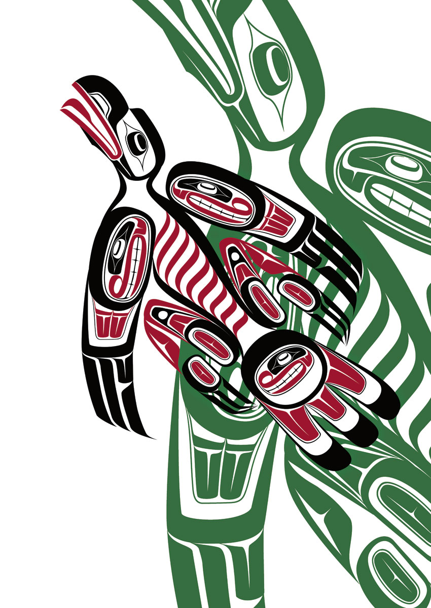 Under the Raven is Ttsaamuus, the Snag, in his Sea Grizzly form. From the Snag’s mouth a third figure, the Raven once again in fledgling form,