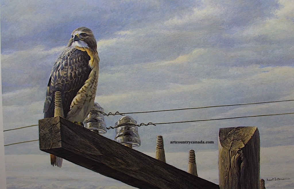 Signed & Numbered Limited Edition Print watching for their prey, but they often like to sit in a place where they can clearly see in all directions. Forest trees are actually not as good as the installations of man for this purpose." Robert Bateman At The Roadside - Red-Tailed Hawk - Robert Bateman ---------------------------------------------------------------------------------------------------------------------------