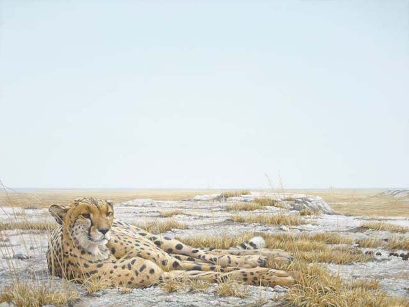 "In the big-game country of Africa I am always aware of the huge, overpowering, blue sky, especially at places like the Amboseli plain in southern Kenya, shown here in Cheetah Siesta. I wanted to feel the presence of the sky in this picture, but I had to be persuaded by my wife, Birgit, that I could put the horizon as low as it is and still have room for the cheetah and the plain. I also had to resist the temptation to let more tall grasses stretch across the horizon, or to introduce a cruising vulture in the distant sky. By leaving it empty, the sky becomes as strong a force in the picture as the cheetah itself." Robert Bateman