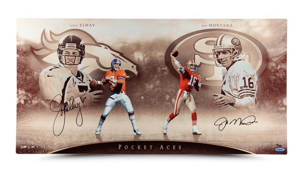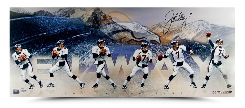 " ART OF THE PASS " Signed Framed Acrylic “Art of the Pass” is an exclusive Upper Deck Authenticated designed collage of Denver Broncos Hall of Famer John Elway. Elway played his entire career in Mile High Stadium with the scenic Rocky Mountains as his backdrop. We have included both elements as visual design components along with the Broncos logo in the backdrop. “Art of the Pass “depicts six images of Elway as he drops back and begins his throwing motion. Over the course of his storied career, Elway led the Broncos to five Super Bowls and two Super Bowl victories. Elway autographed this 36" x 15" image (limited edition of 50) in black paint pen. His autograph is deemed authentic by virtue of Upper Deck Authenticated’s Five Step Process.