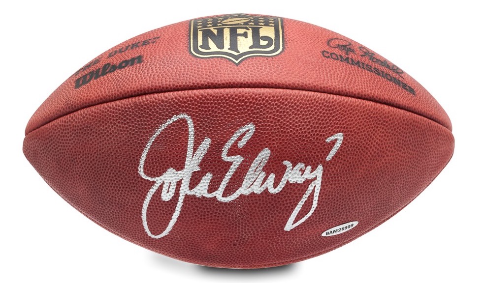 " WILSON FOOTBALL " Signed John Elway quarterbacked the Denver Broncos for sixteen seasons. Over the course of his storied career, Elway led the Broncos to five Super Bowls and two Super Bowl victories. He is regarded as one of the greatest quarterbacks of all time. The Broncos have retired his number #7 jersey and add him to their Ring of Fame. Elway has signed this Wilson ‘The Duke’ football in silver paint pen. His signature is deemed authentic by virtue of Upper Deck Authenticated’s Five Step Process.