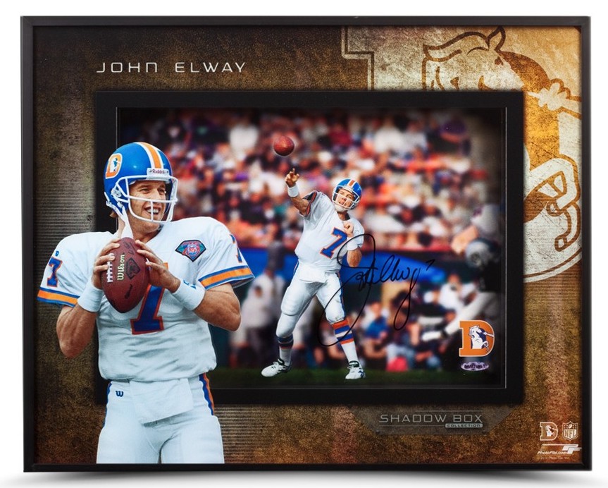 John Elway has signed many pieces of memorabilia over his storied career, but he has never signed anything quite like this “Prolific Passer” three dimensional Shadow Box. The outer acrylic layer features an image of Elway in his road white and throwback Broncos helmet. The middle signed layer shows John Elway as he throws the ball down field. Elway’s shadow is revealed on the back layer, which houses an image of the Oakland Raiders crowd. This multi layered shadow box contains images on each layer with the all-important signature housed on the middle clear acrylic sheet. John Elway has signed his name in black paint pen. The layers of the shadow box are housed in a black metal frame making the overall framed dimension “20.5 x 2.5 x 16.5”. The 3-D Shadow Box Collection by Upper Deck Authenticated is sure to be fan favorites and the topic of conversation when viewed for the first time. Elways’ signature was witnessed under UDA’s Five-Step Authentication Process.