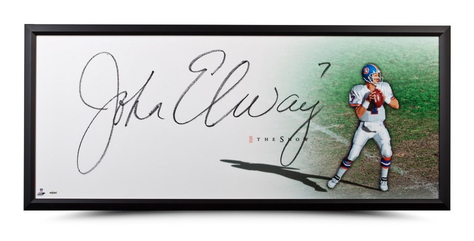 " THE SHOW " Signed Framed Acrylic Upper Deck Authenticated’s signature line item “The Show” features the largest signatures ever produced by the top level athletes that have partaken in inking their name for us. John Elway is just the latest hall of fame talent to do so. John Elway was selected to the NFL 1990’ All-Decade Team after quarterbacking his team to five Super Bowls including two victories and countless Broncos and NFL passing records. The Denver Broncos Hall of Fame quarterback is shown reading the defense as he looks to throw the ball down field. Elway has signed this eye popping 46” x 20” framed display in a thick black pen. His signature is deemed authentic by virtue of Upper Deck Authenticated’s Five-Step Process.