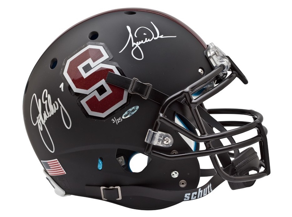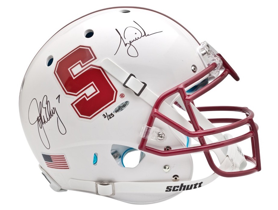 " JOHN ELWAY & TIGER WOODS WHITE STANFORD AUTHENTIC HELMET " Signed When it comes to Stanford University greatest athletes, Tiger Woods and John Elway stand at the top of the list. In just two years at Stanford, Tiger Woods won two U.S. Amateur Championships, was an NCAA First Team All-American, was voted Pac-10 Player of the Year, was Stanford’s Male Freshman of the Year, and won the NCAA individual golf championship. After his sophomore year at Stanford, Woods turned pro. John Elway on the other hand, was a two sport athlete during his four years at Stanford. He was a right fielder and pitcher for the baseball team and a three year starting quarterback for the football team. Elway’s college career was storied, but it did not include any bowl games. He left Stanford as a two time Pac-10 Player of the Year, and an All American. John left with 9,349 passing yards and 77 touchdowns and nearly every Stanford and Pac 10 career passing and total offensive mark. Upper Deck Authenticated has paired these two Stanford legends on this limited edition (25) authentic Schutt White Stanford Helmet. Each athlete has signed in black paint pen. Pay homage to their alma mater with this unique memorabilia piece. Their signatures have been authenticated by virtue of Upper Deck Authenticated’s Five-Step Authentication Process.