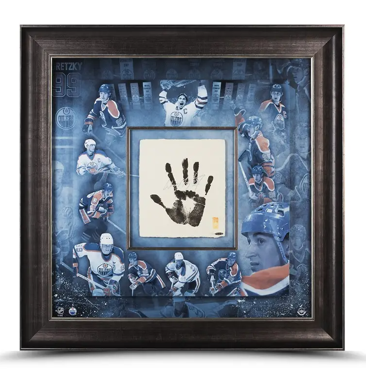 WAYNE GRETZKY AUTOGRAPHED TEGATA WITH OILER All Star -80879 Limited To: 99 Signed By: Wayne Gretzky Type: Autographed and Framed Tegata Size: 36" x 36" Pen Color: Silver Special Details: Framed, Authentic Inked Hand Print