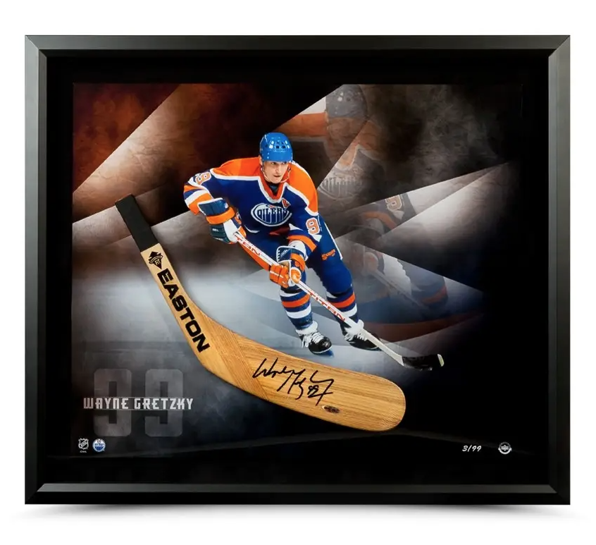 The G.O.A.T (greatest of all time) Wayne Gretzky saw his greatest success as a member of the Edmonton Oilers. From 1979, he began rewriting the NHL’s record books. Whether it is scoring 50 goals in the shortest amount of games (39), scoring the most goals (92), recording the most assists (163), or scoring the most points (215) in a season all were accomplished as a member of the Oilers. These amazing feats earned Wayne Gretzky eight straight Hart Trophies as league MVP. This specially designed shadow box contains a limited edition (99) designed Edmonton Oilers ‘Smoking Mirror’ image with an autographed Easton wood stick blade. Wayne Gretzky has inked his name in black paint pen. The overall framed piece measures “28 x 24”. Gretzky’s signature was witnessed under UDA’s Five-Step Authentication Process.