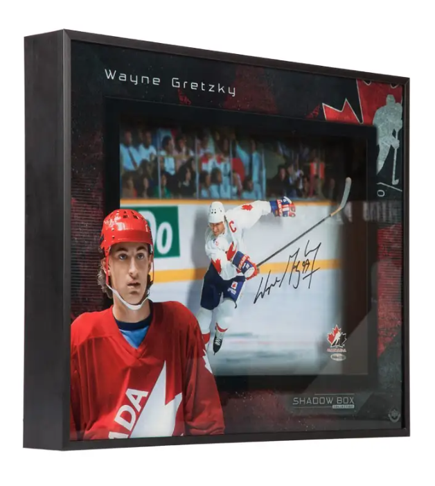 Upper Deck Authenticated has taken the 2.5" x 3.5" trading card technology and transformed it into a 16 x 20 piece of wall memorabilia. The outer acrylic layer features an image of Wayne Gretzky in his red Team Canada jersey showing extreme focus. The middle signed layer exhibits Gretzky as he skates down the ice, and his shadow is revealed on the back layer. This multi-layered shadow box contains images on each layer with the all-important signature housed on the middle clear acrylic sheet. Gretzky has signed his name in black paint pen. The layers of the shadow box are housed in a black metal frame making the overall framed dimension 20.5" x 2.5" x 16.5". The 3-D Shadow Box Collection by Upper Deck Authenticated is sure to be fan favorites and the topic of conversation when viewed for the first time. Gretzky's signature was witnessed under UDA's Five Step Authentication Process.