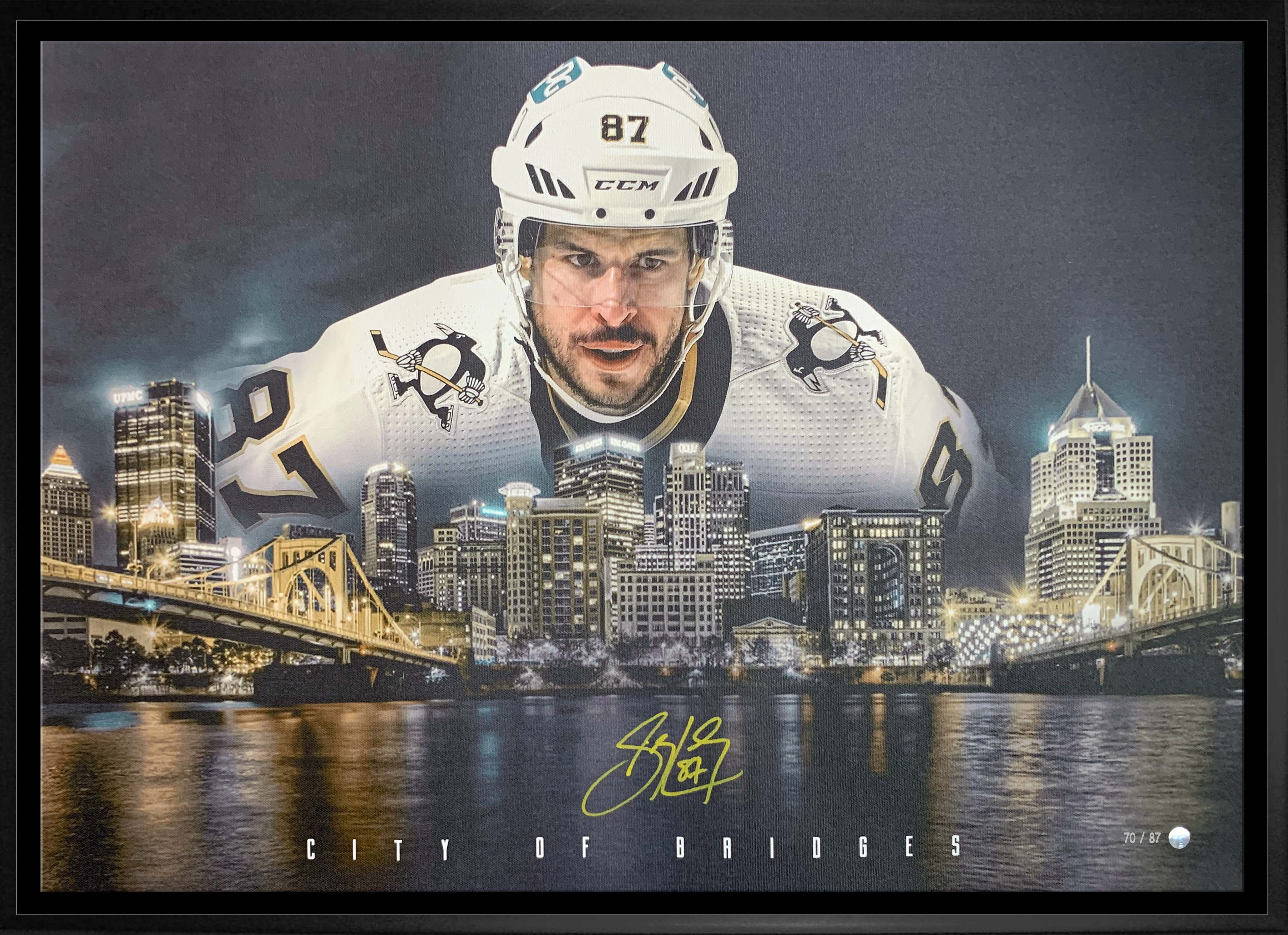 " SIDNEY CROSBY PITTSBURGH PENGUINS CITY OF BRIDGES " Stretched Canvas Show off your civic and team pride with this Frameworth exclusive Skyline Sidney Crosby signed canvas. Prior to the canvas being professionally stretched and framed, it will be personally hand-signed by Sidney. This item is licensed by the National Hockey League (NHL) and National Hockey League Players Association (NHLPA) and is accompanied by a Frameworth hologram and certificate of authenticity to ensure the legitimacy of the signature. This piece is limited out of 87. Finished Size: 22x31"