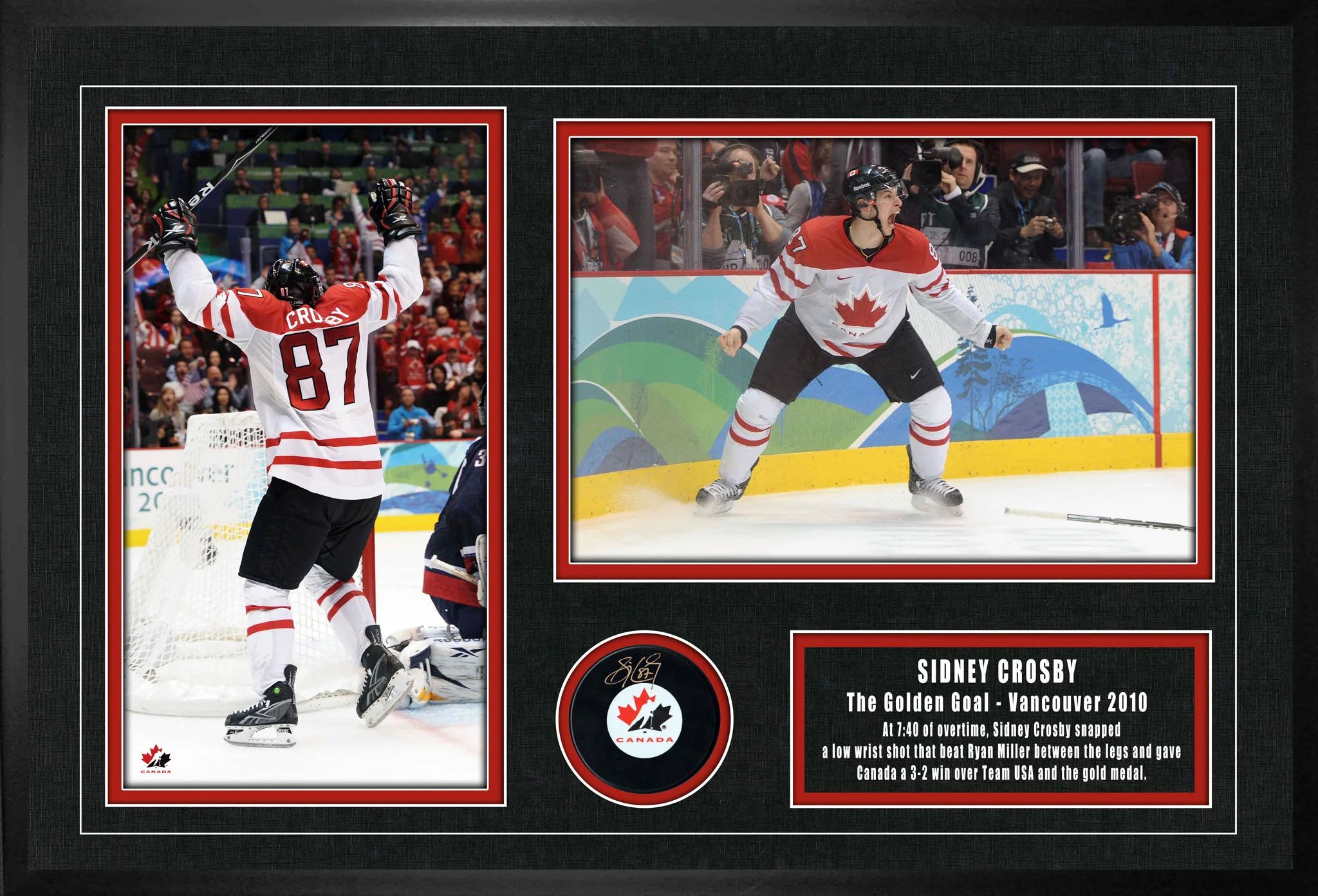 " SIDNEY CROSBY SIGNED TEAM CANADA GOLDEN GOAL AND PUCK " Framed Photo This Team Canada puck comes personally autographed by Sidney Crosby before being professionally framed. This puck comes with a certificate of authenticity and hologram from Frameworth to ensure authenticity. Signatures may vary.
