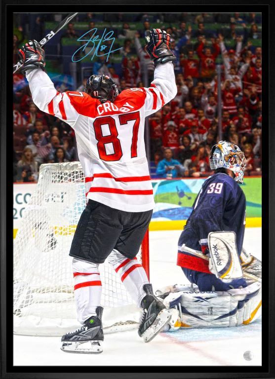 " SIDNEY CROSBY TEAM CANADA " Stretched Canvas Dubbed the "Golden Goal", this moment is entrenched in the minds of all Canadians who watched the game. Commemorate this great Canadian moment with this unique 20x29 framed Canvas of the moment, signed by Sidney Crosby himself. This piece comes with a hologram and certificate of authenticity to ensure the legitimacy of the autograph. Finished Size: 22.5x31.5