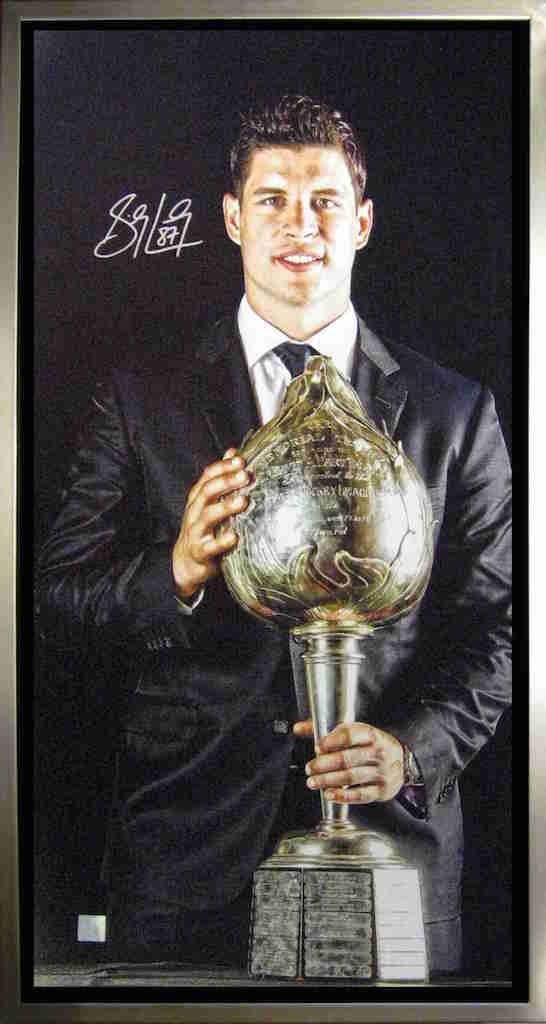 " SIDNEY CROSBY HART TROPHY " Stretched Canvas This stunning image of Sidney Crosby has been filtered to replicate the look of a panting, and comes printed on a textured gloss canvas. The canvas has been stretched and stapled on the back to a 3/4" deep wooden stretch bar and set in Frameworth's renowned framing. Perfect for any home or office and a unique addition to any hockey collection.This canvas has been hand signed by Sidney Crosby himself. A certificate of authenticity is included with this piece. FINISHED SIZE 20x30"
