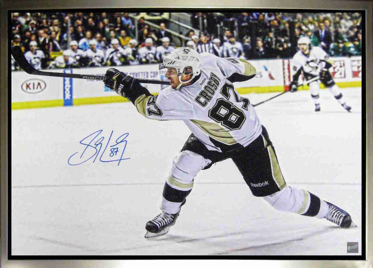 " SIDNEY CROSBY SHOOTING HIS 500th GOAL PENGUINS VS FLYERS " Framed Canvas This image of Sidney Crosby is printed on high quality art canvas before being personally autographed by Sidney Crosby, and then being professionally stretched and framed. This canvas is officially licensed by the National Hockey League (NHL) and National Hockey League Players Association (NHLPA) and comes with a certificate of authenticity and hologram from Frameworth to ensure authenticity. Signatures may vary. Made in Canada. Limited Edition of 87 - once it's sold out, it's gone forever!. Finished Size: 31.5x22.5