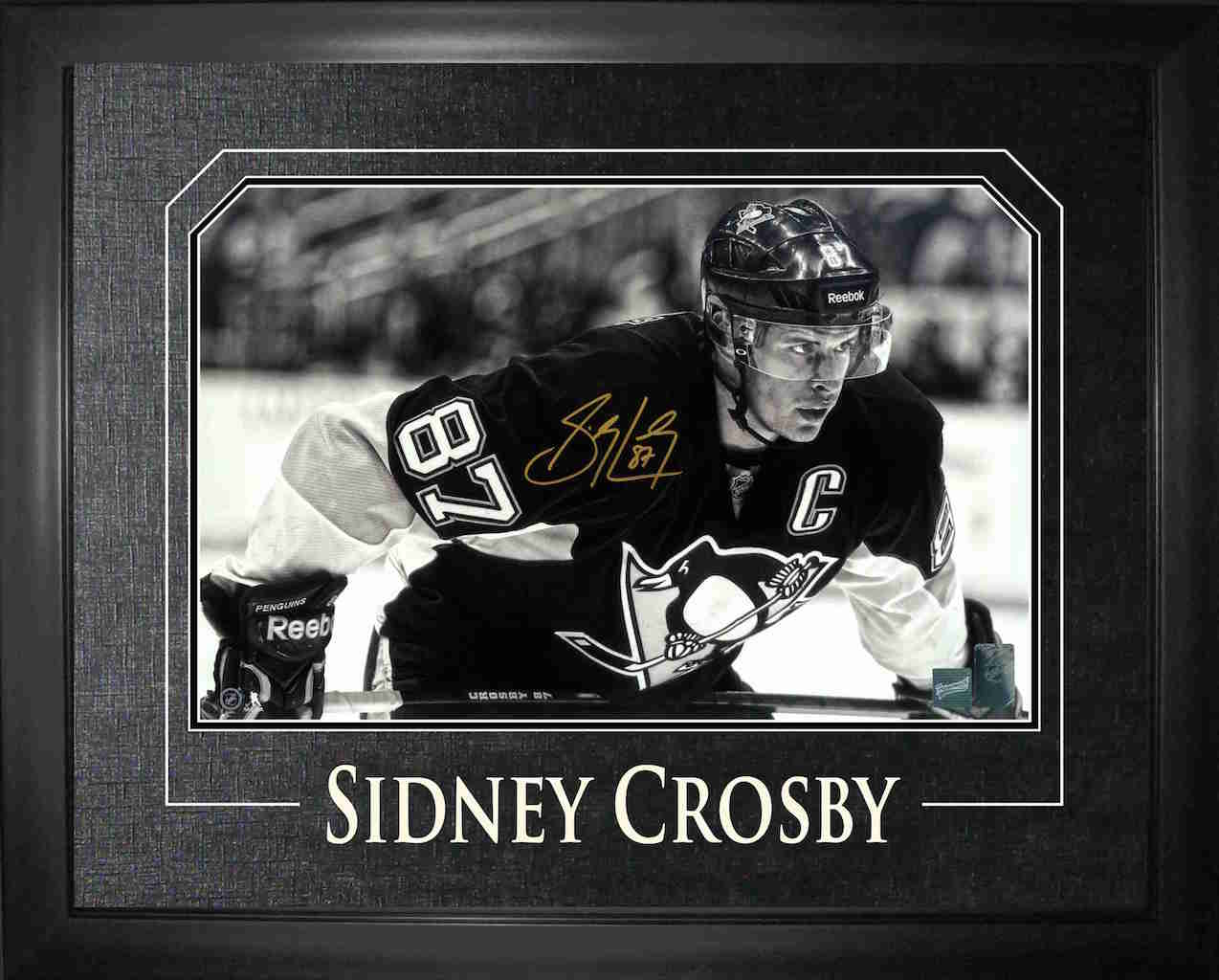 " SIDNEY CROSBY BLACK/WHITE " Framed Signed Print This 11x17" photo of Sidney Crosby has been hand signed by the Pittsburgh Penguins star. This picture comes framed with black matting that has a decorative v-groove. An amazing addition to any collection. FINISHED SIZE 25X20"