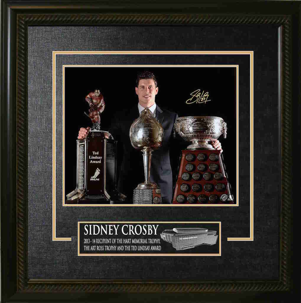" SIDNEY CROSBY TROPHIES " Framed Signed Print This unique frame features a Sidney Crosby hand-signed 16" x 20" photo featuring Crosby with the Hart memorial Trophy, The Art Ross Trophy, and The Ted Lindsay Award. The frames comes with a laser etching describing the trophies, as well as an etching of the home stadium. This item has a black frame and includes a decorative v-groove. Perfect for any home or office and a unique addition to any hockey collection. A Frameworth Certificate of Authenticity is included. FINISHED SIZE 27" x 34"