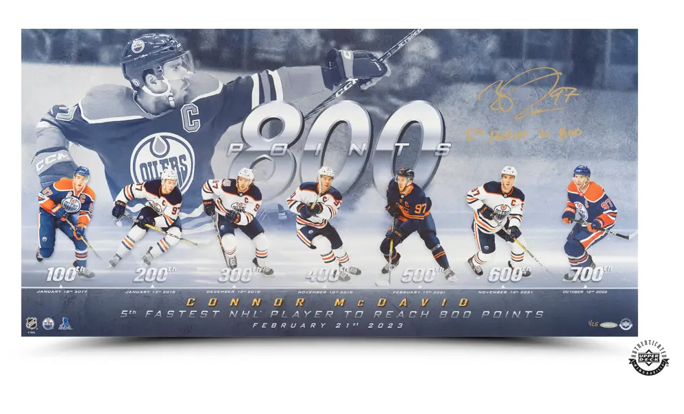 This image is autographed & inscribed “5th fastest to 800” by Connor McDavid. McDavid’s signature and inscription were