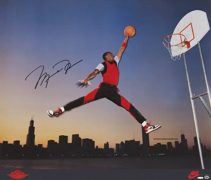 Jordan has autographed this Nike Air Time 35" x 30" image in black paint pen.