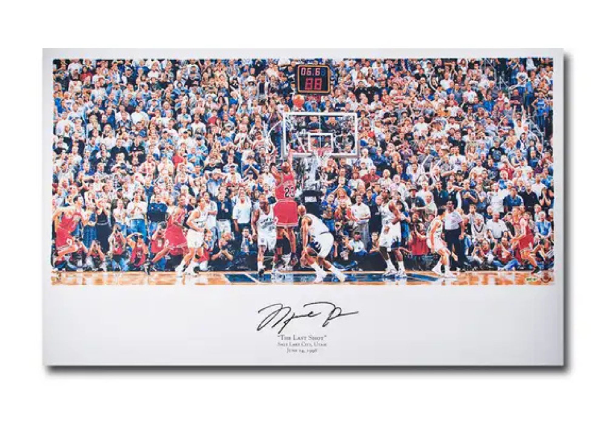 Jordan's autograph has been authenticated by virtue of UDA's Five-Step Authentication Process. This piece is a replica art print of world renowned memorabilia artist Chuck Gillies original commissioned painting of Michael Jordan's last shot vs the Utah jazz in the 1998 NBA finals.